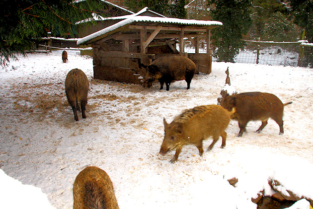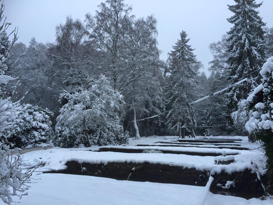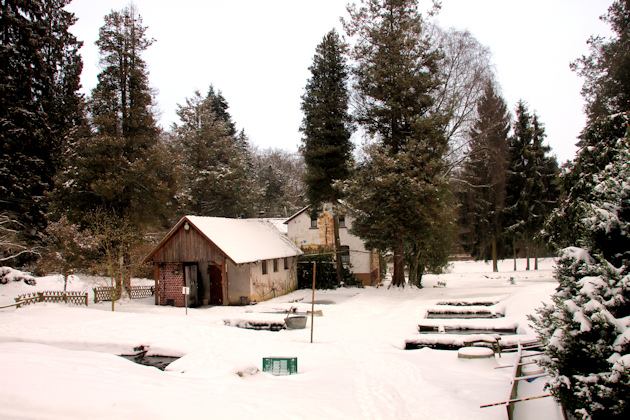 Zur Winterzeit herrscht Ruhe im Biergarten. Der Lebendigkeit und dem Gewusel des Sommers ist eine Stille gewichen, welche die Natur im Forellengut Herzberger besonders an kalten Tagen mit Schneefall in winterlicher Gewand erscheinen lässt. Ein Springbrunnen vor dem Haus schafft es bei besonderem Frost immer wieder, ansehnlich große Eisskulpturen wachsen zu lassen, mitunter bis zu 3m hoch. Zahlreichem Federvieh macht die Kälte wegen des warmen Gefieders nichts aus; auch die Wildschweine in unserem Gehege sind winterliche Temperaturen gewohnt. Wer glaubt, der Winter sei hier eine gute Zeit für das Nichtstun, der irrt. Die zugefrorenen Fischteiche müssen regelmäßig von geschlossenen Eisdecken befreit werden, damit das Wasser weiterhin ausreichend Sauerstoff für die Fische aufnehmen kann.